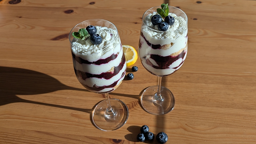Das Tiramisu kurz vor dem Servieren mit einigen Blaubeeren garnieren. Bei Bedarf gerne Minze verwenden oder weiße Schokolade drüber raspeln.