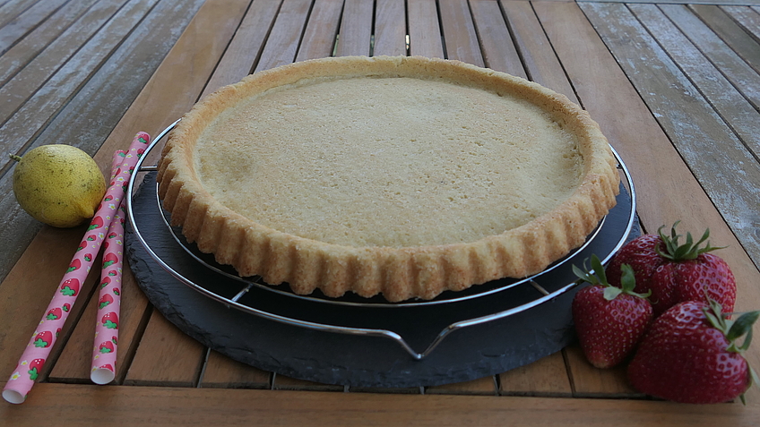 Den Teig in eine eingefettete und bemehlte Tartebodenform geben und bei 210-225°C etwa 10 Minuten backen bis der Teig leicht braun ist.