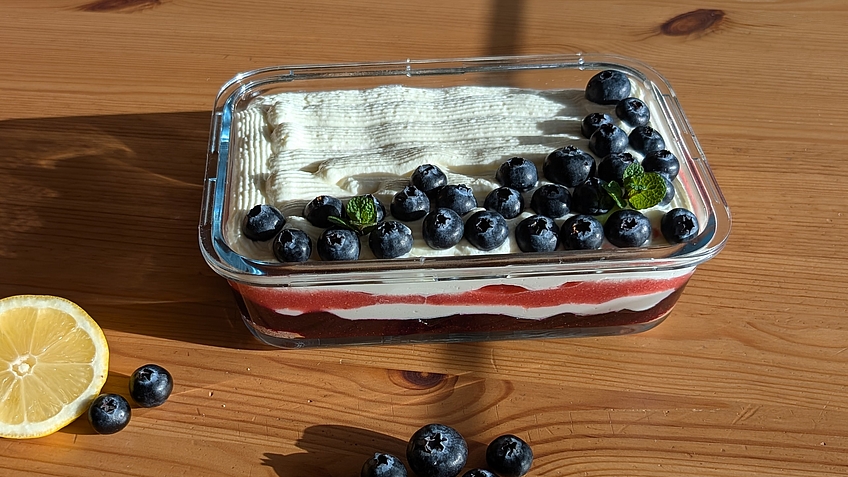 Das Tiramisu kurz vor dem Servieren mit einigen Blaubeeren garnieren. Bei Bedarf gerne Minze verwenden oder weiße Schokolade drüber raspeln.